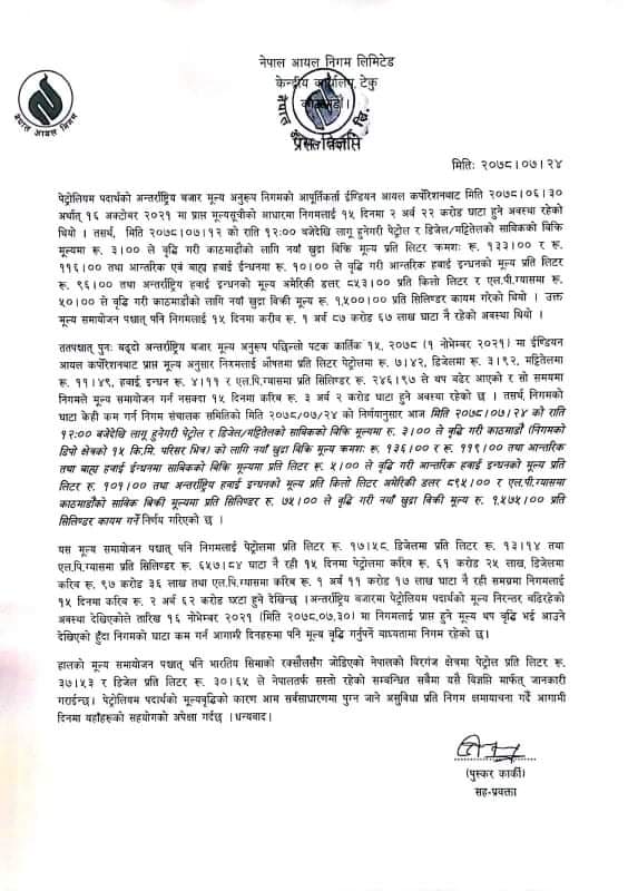 नेपाल आयल निगमले फेरि डिजेल पेट्रोल र मट्टितेलको मूल्य बढाएको छ ।
