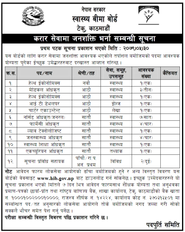 करार सेवामा जनशक्ति भर्ना गर्न बोर्डले हेल्थ इकोनोमिक्स, मेडिकल अधिकृत, हेल्प इकोनोमिक्स, आईटी डेभलपर, चार्टर एकाउन्टेन्ट, नर्सिङ अधिकृत, फार्मेसी अधिकृत, ल्याब टेक्नोलोविस्ट, जनस्वास्थ्य अधिकृत, स्वास्थ्य शिक्षा अधिकृत, एकच्यूरियन अधिकृत र सूचना प्रविधि सहायक पदमा दरखास्त आह्वान गरेको हो ।